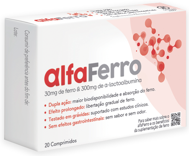 O alfaFerro é um suplemento alimentar com pirofosfato férrico microencapsulado (SunActive® Fe) e α-lactoalbumina, desenvolvido com base em evidência científica para colmatar eficazmente as carências de ferro, com melhor tolerabilidade.